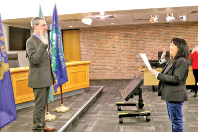 West Bloomfield Township Clerk Debbie Binder swears in Jonathan Warshay to be the township’s new supervisor Dec. 9. Warshay was sworn in following a special meeting, where the Township Board appointed him to the position.