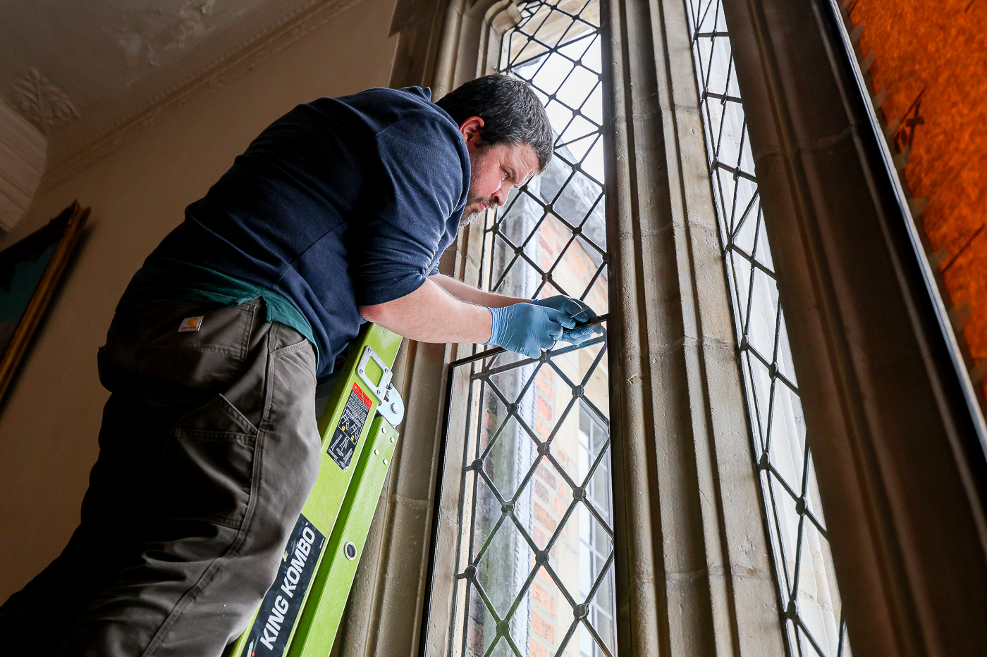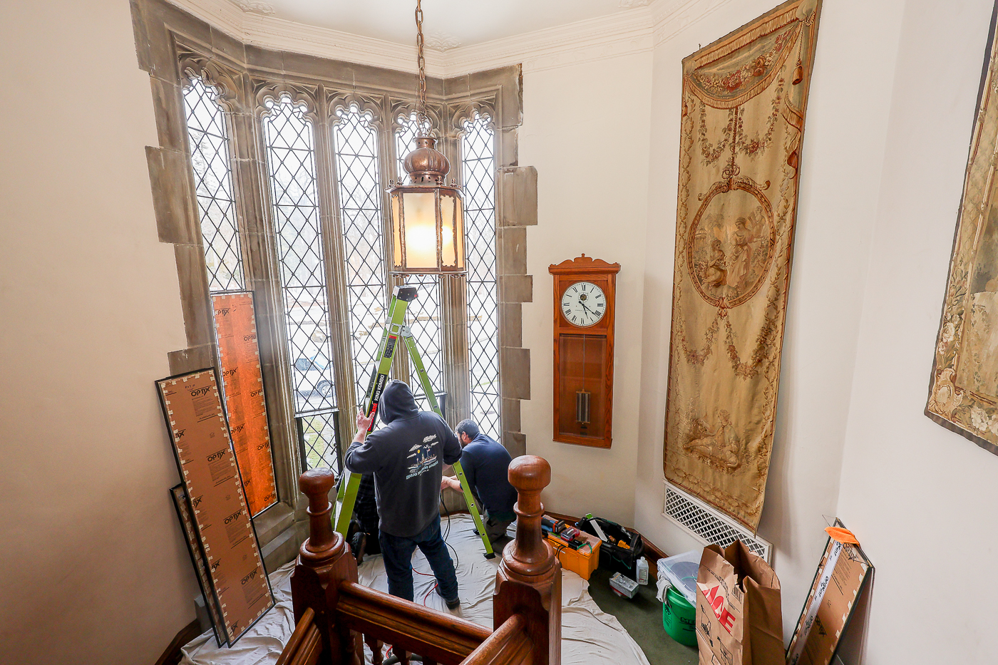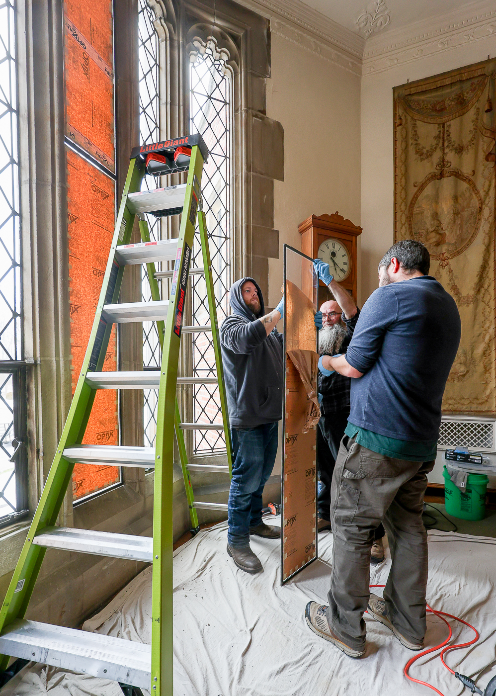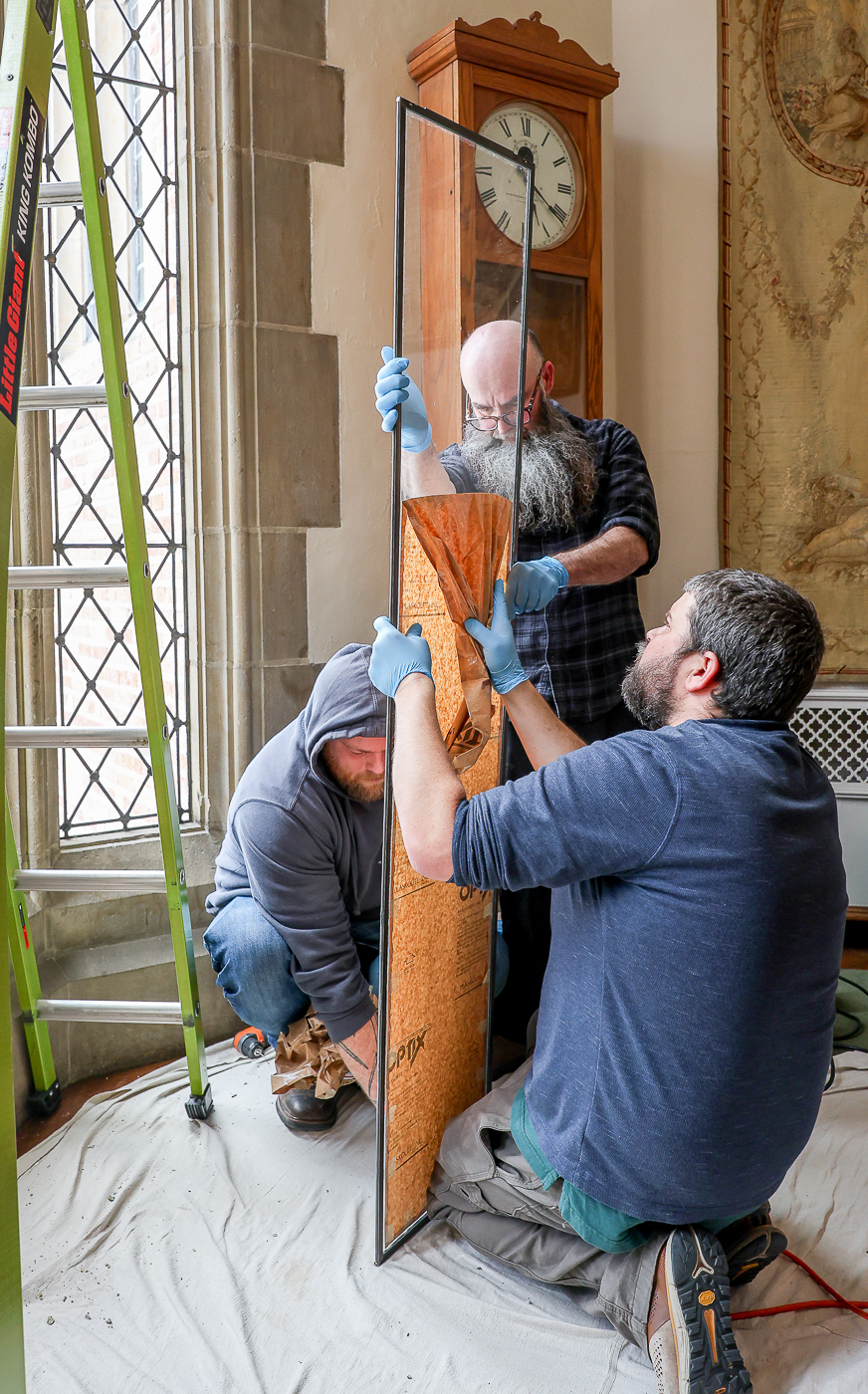 A crew of artisans work at Meadowbrook on the final phase of window repairs