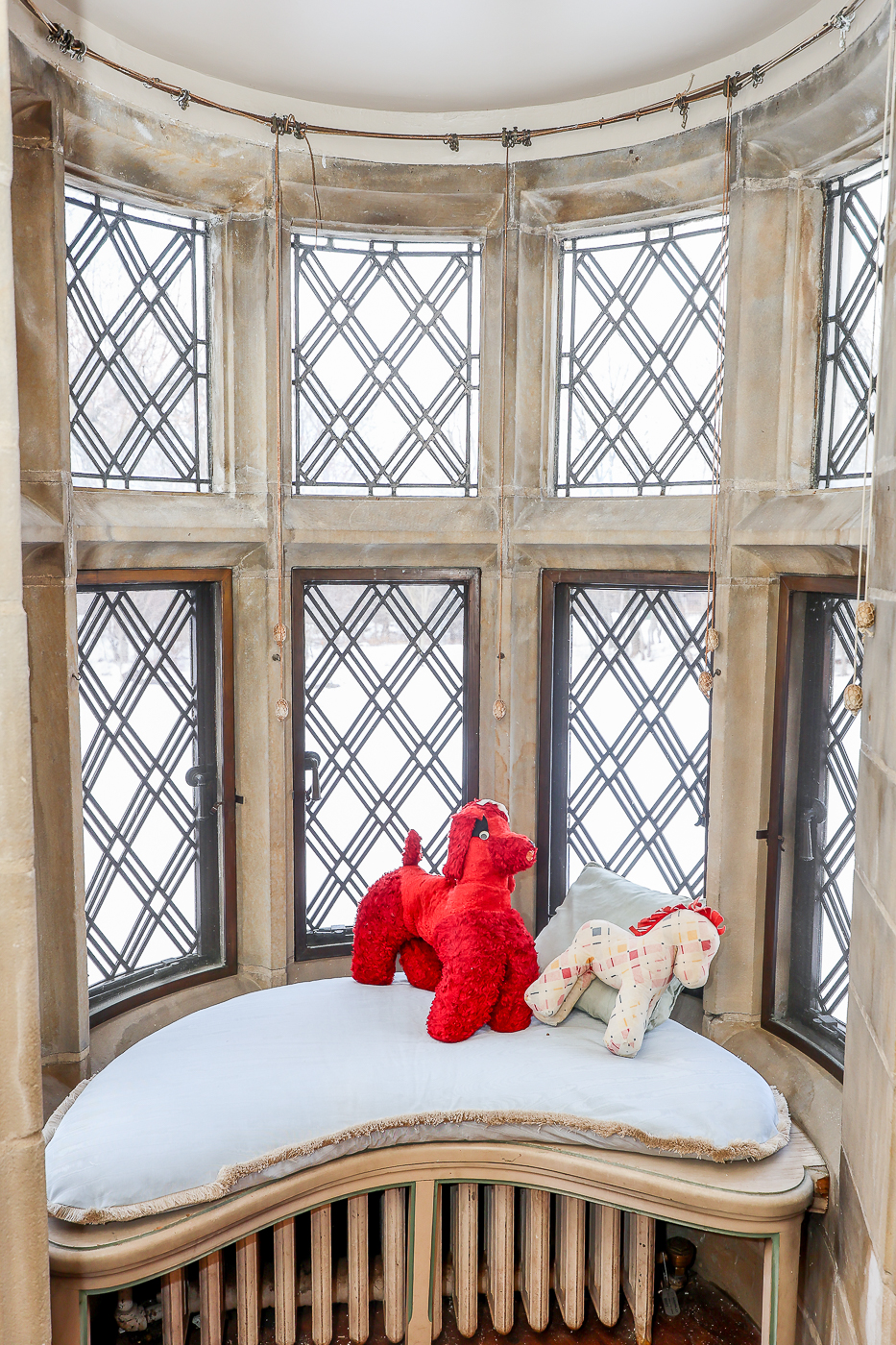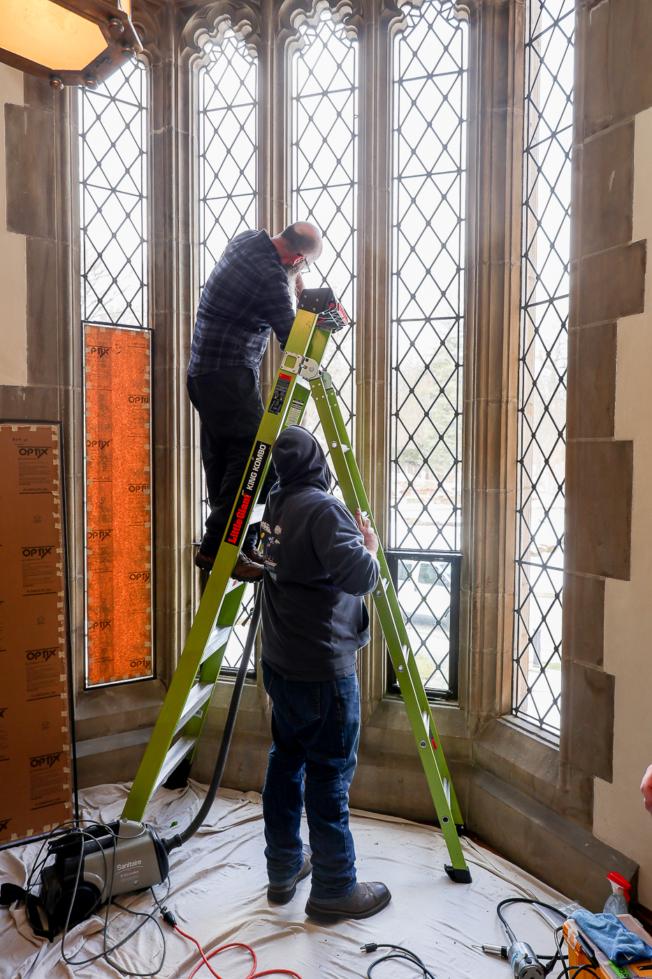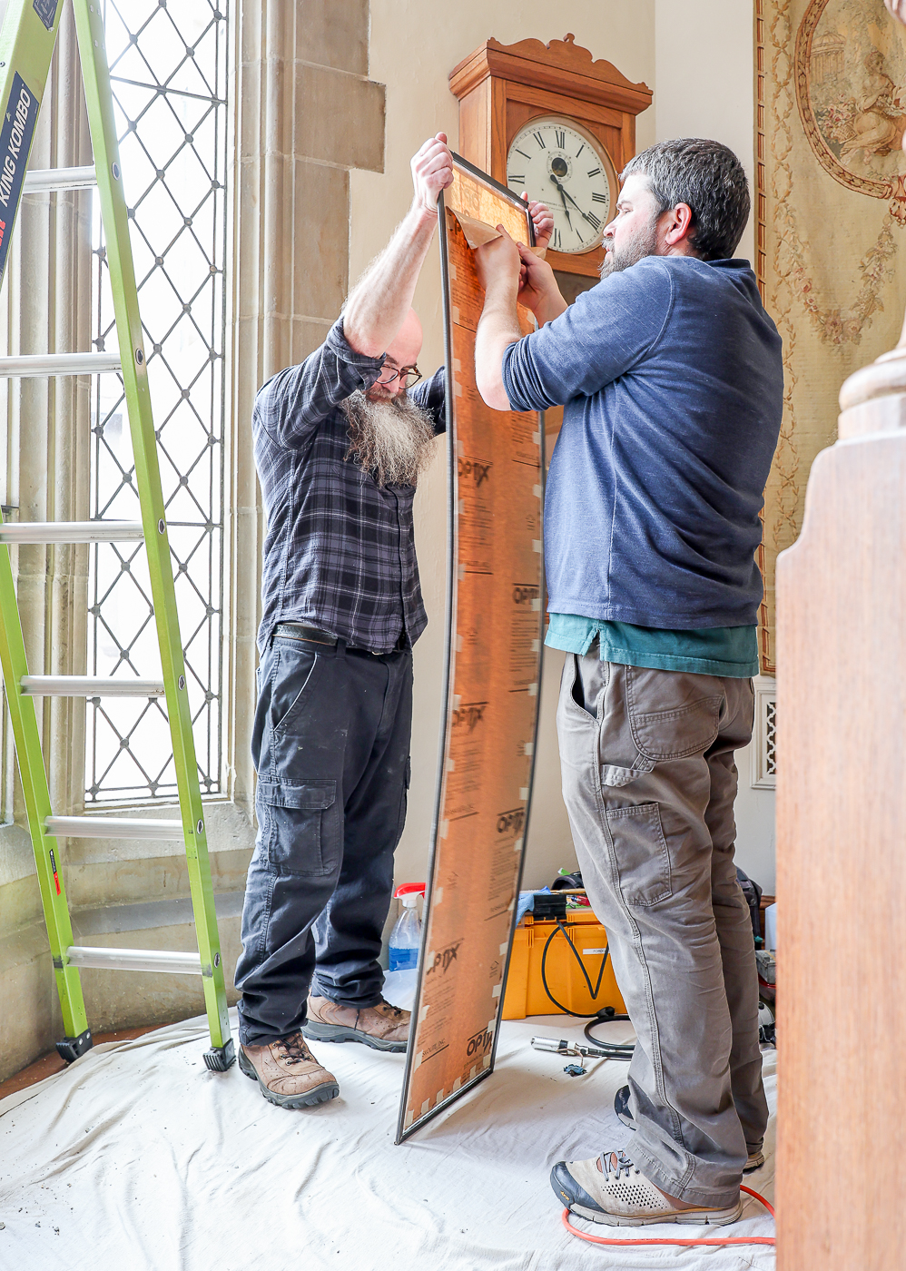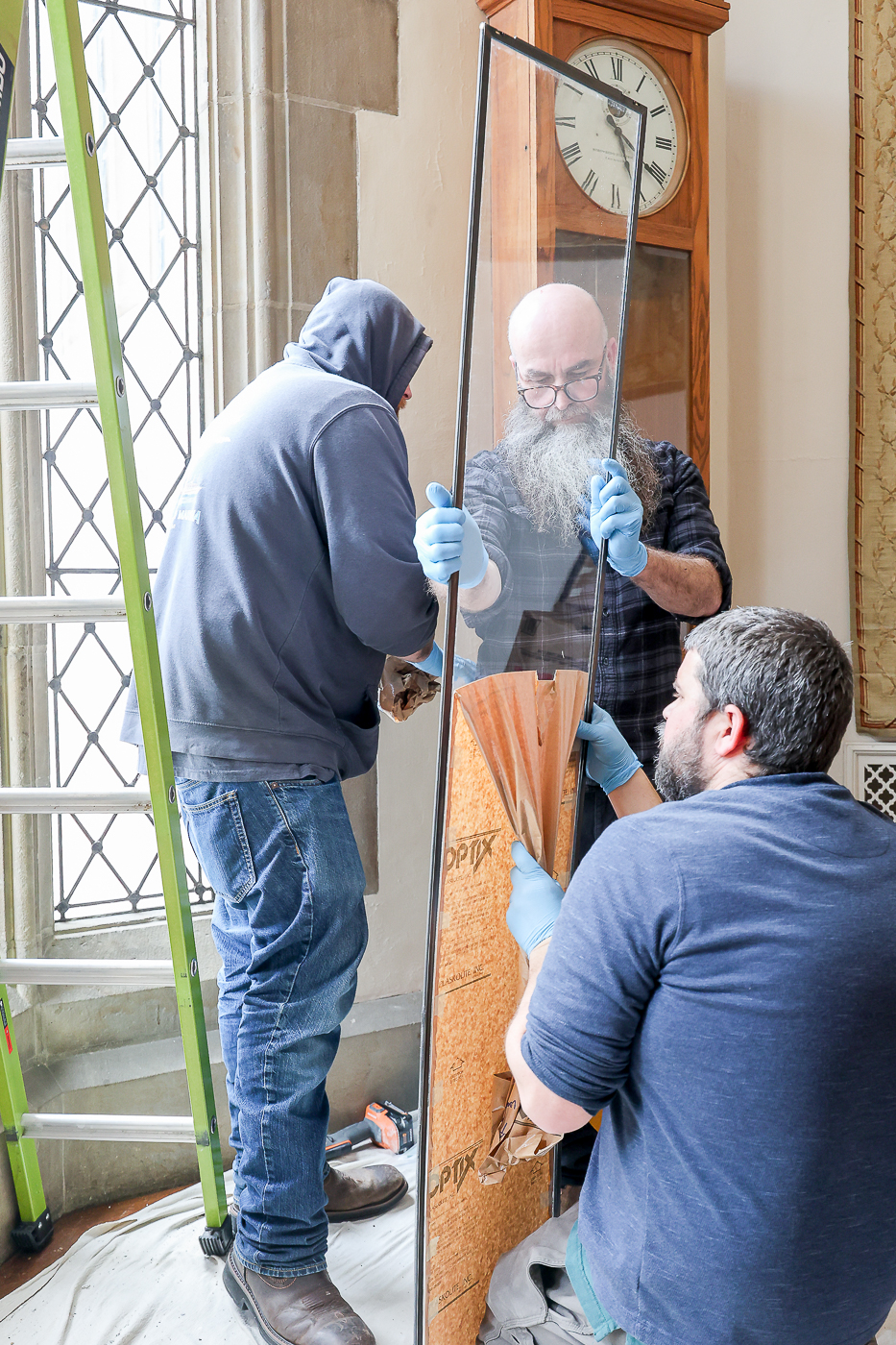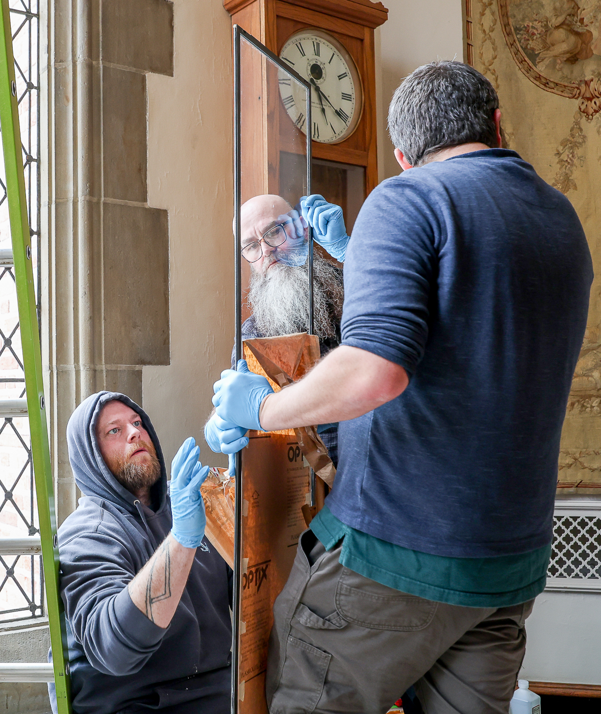 A crew of artisans work at Meadowbrook on the final phase of window repairs