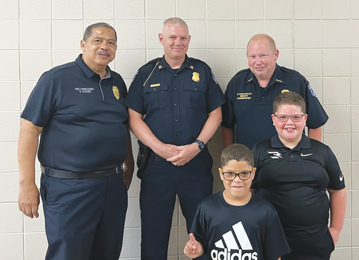 The fire commissioner, along with Warren Police Commissioner Charles Rushton and other police officers, congratulated Chance and Jaxon Mason and presented them with a goodie bag that included Warren Fire Department helmets.