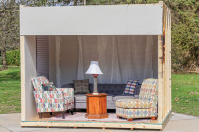 A living room was built in a structure approximately 10 feet by 10 feet that included the type of furnishings that can be found in many living rooms — an upholstered sofa, two upholstered chairs, tables, lamps, and drapes. A trained firefighter in full gear ignited the drapes. Just seconds afterwards, when only a small flame was visible, the smoke alarm sounded.
