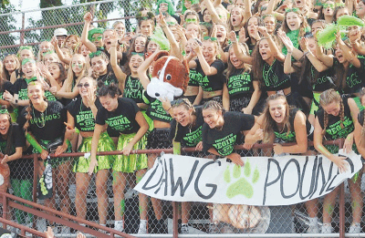 The Regina Bulldogs “Dawg Pound” student section cheers on their team during Regina’s matchup against Bloomfield Hills Marian on Sept. 16 at Hazel Park High School.