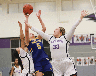 Bloomfield Hills junior center Ruby Smith (#33) and junior guard Michele Barnett apply the defense to Bloomfield Hills Marian junior McKenzie Swanson.
