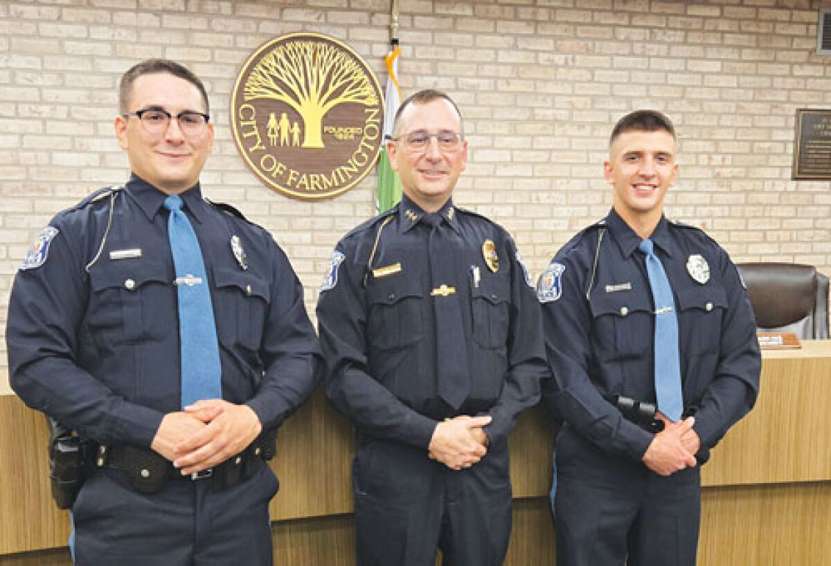 “Gentleman, you have a front row seat to the greatest show in the world. You will be given the opportunity and do some amazing things,” said Farmington Public Safety Director Robert Houhanisin, center, to the newly sworn in officers Jonah Fanning, left, and Jackson Murray at the May 19 Farmington City Council meeting.