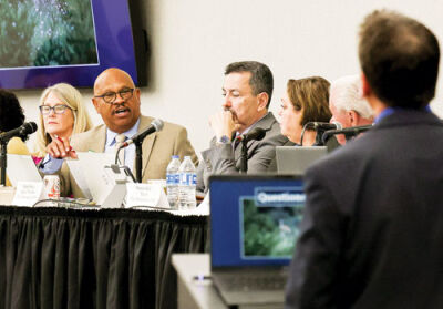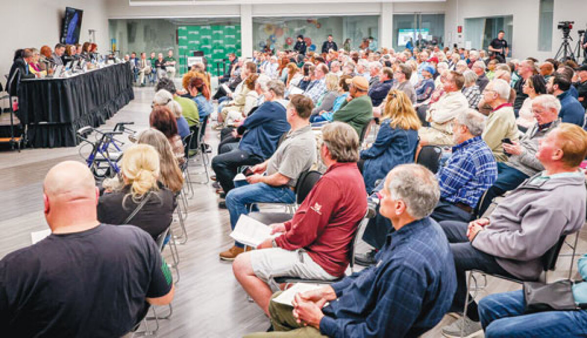 The 200-seat room was chosen to better accommodate the public but still filled to the brim, with overflow in the hallway and nearby rooms.