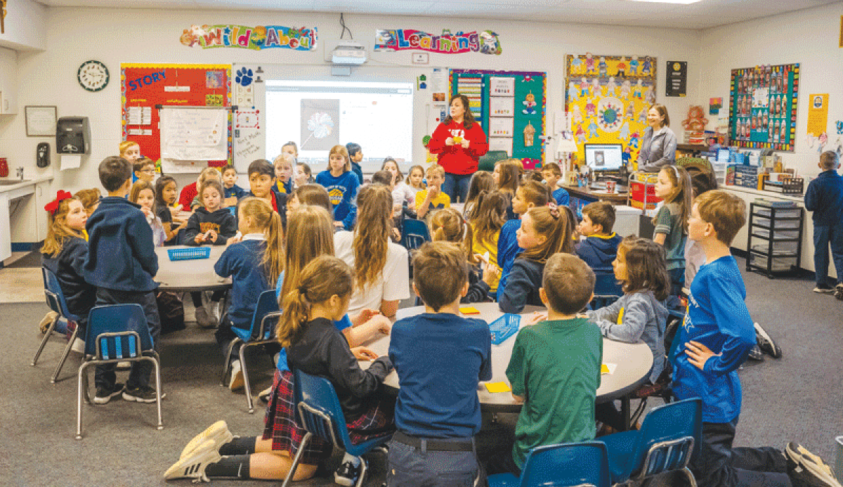 Kathy Guirey, center, a first-grade teacher at Our Lady of Victory Catholic School in Northville, teaches students in class during a previous school year.
