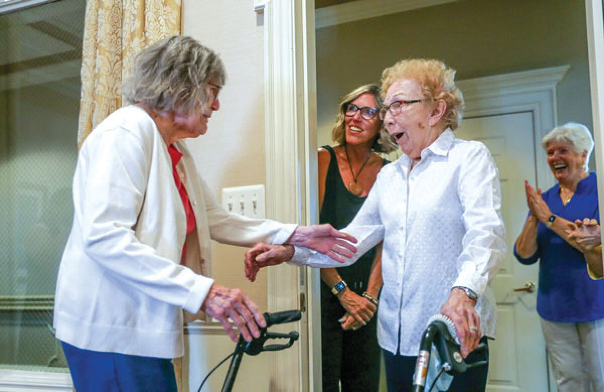 Waltonwood Twelve Oaks staff arranged for Joy Klomp, 86, left, to fly in from California to surprise her sister, Carol Timmer, 91, right, at the Novi senior living facility where Timmer resides. Klomp and Timmer had not seen each other in five years, and Timmer mentioned at a Waltonwood event that she wished she could see her sister again.