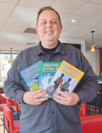 James Fabin, of Farmington, a local author who lives with chronic kidney disease, shows off the three books he has written on the subject.