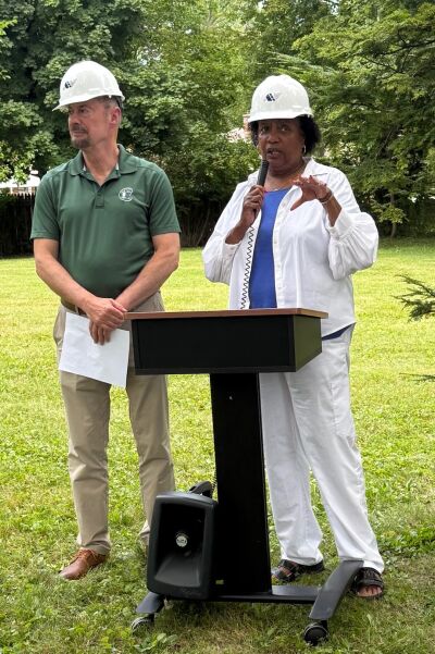 From left, Harper Woods City Manager John Szymanski and Mayor Valerie Kindle address attendees during the groundbreaking for Roscommon Pocket Park.