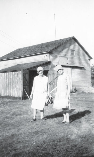 SHELBY TOWNSHIP — In this photo, pictured left, from 1925, Josephine Switzer and Ethel Messmore stand outside a barn in the old village of Disco in Shelby Township. They are wearing hats and dresses that are typical of fashion in the 1920s. While not the flamboyant high style usually associated with the Gatsby era, these everyday dresses feature the drop waist, the hemline just below the knee, and the loose top that were considered fashionable back then. Note also the cloche hats, which hug the head and hide much of the wearer’s face.