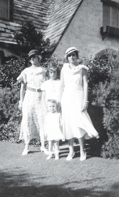 In the 1930s, women’s fashion shifted to a more feminine style with longer, slimmer dress lines and smaller, more face-revealing hats such as seen in this photo, pictured right, from 1933. Here Mrs. Lucile Vincent, wife of Packard Proving Grounds manager Charles Vincent, models the latest in women’s fashion along with her three daughters in front of the Gate Lodge at the Proving Grounds. Note that the two older Vincent women wear dresses that are in a more feminine style with higher, accentuated waist lines, longer mid-calf hemlines, and rounder necklines. And note the hats that reveal more of the wearer’s face. The four Vincent women are, from left, Lucile, Cornelli, Dorothea, and Roberta (front).