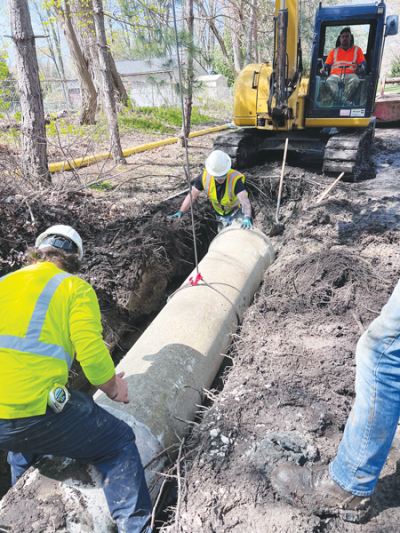The Macomb County Department of Public Works replaces the rotted pipe with a new 18-inch-diameter concrete pipe.