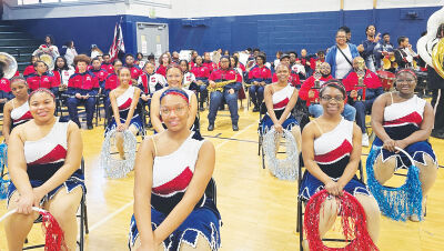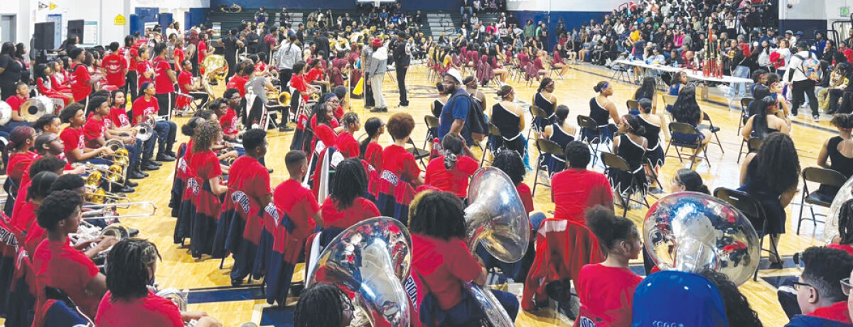 The 100-piece Southfield A&T Marching Warriors pose for a photo at the 2025 “Silence the Violence” Battle of the Bands, which was hosted at Center Line Preparatory Academy on April 12.