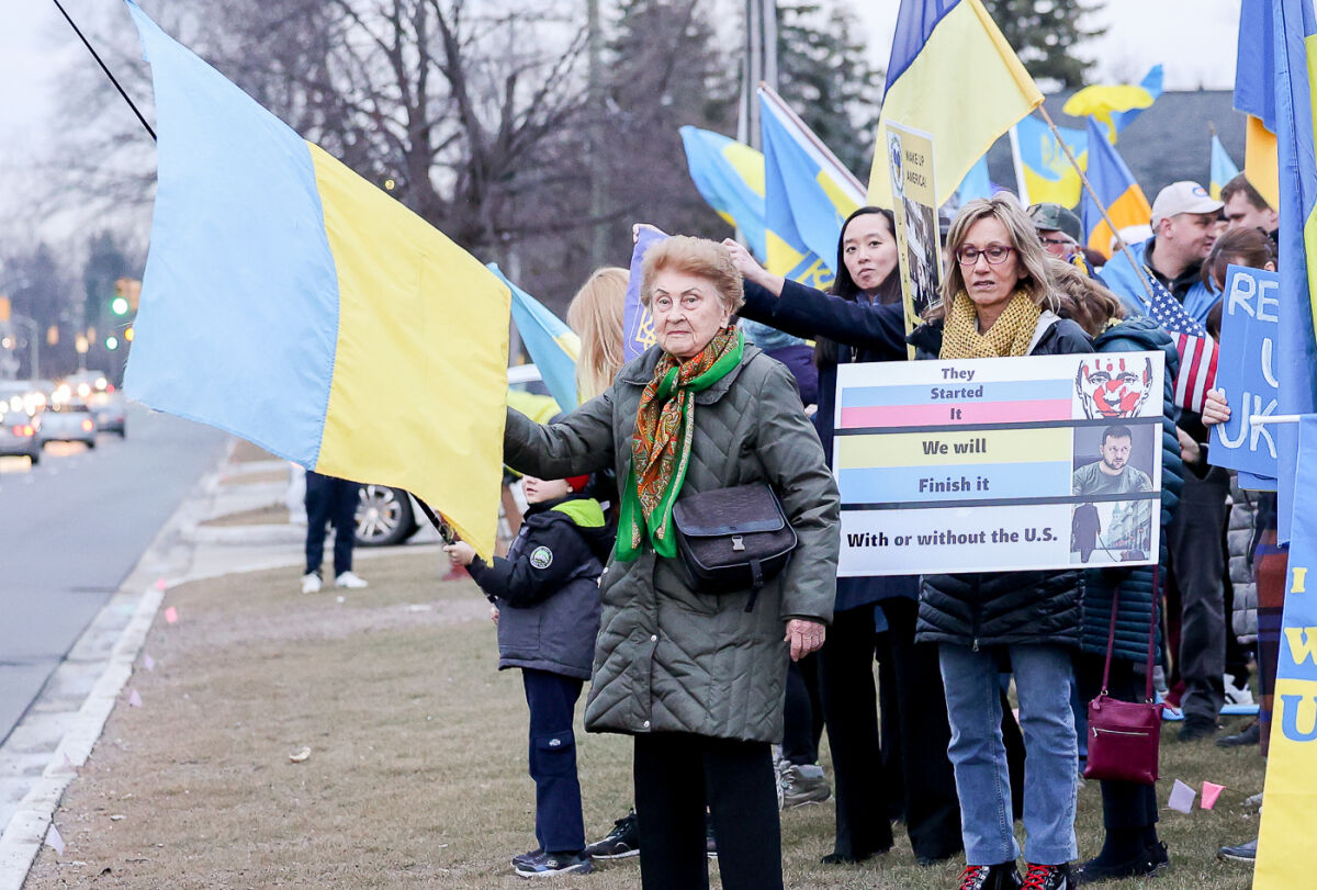 Andy Blysniuk, a Ukrainian American, held up a sign that said, “Ukraine needs our help not Russia!” Blysniuk has lived in Royal Oak for about 25 years. His parents went to Canada after World War II. He said he’s confused about the United States’ relationship with Russia and the U.S. “throwing Ukraine under the bus.”