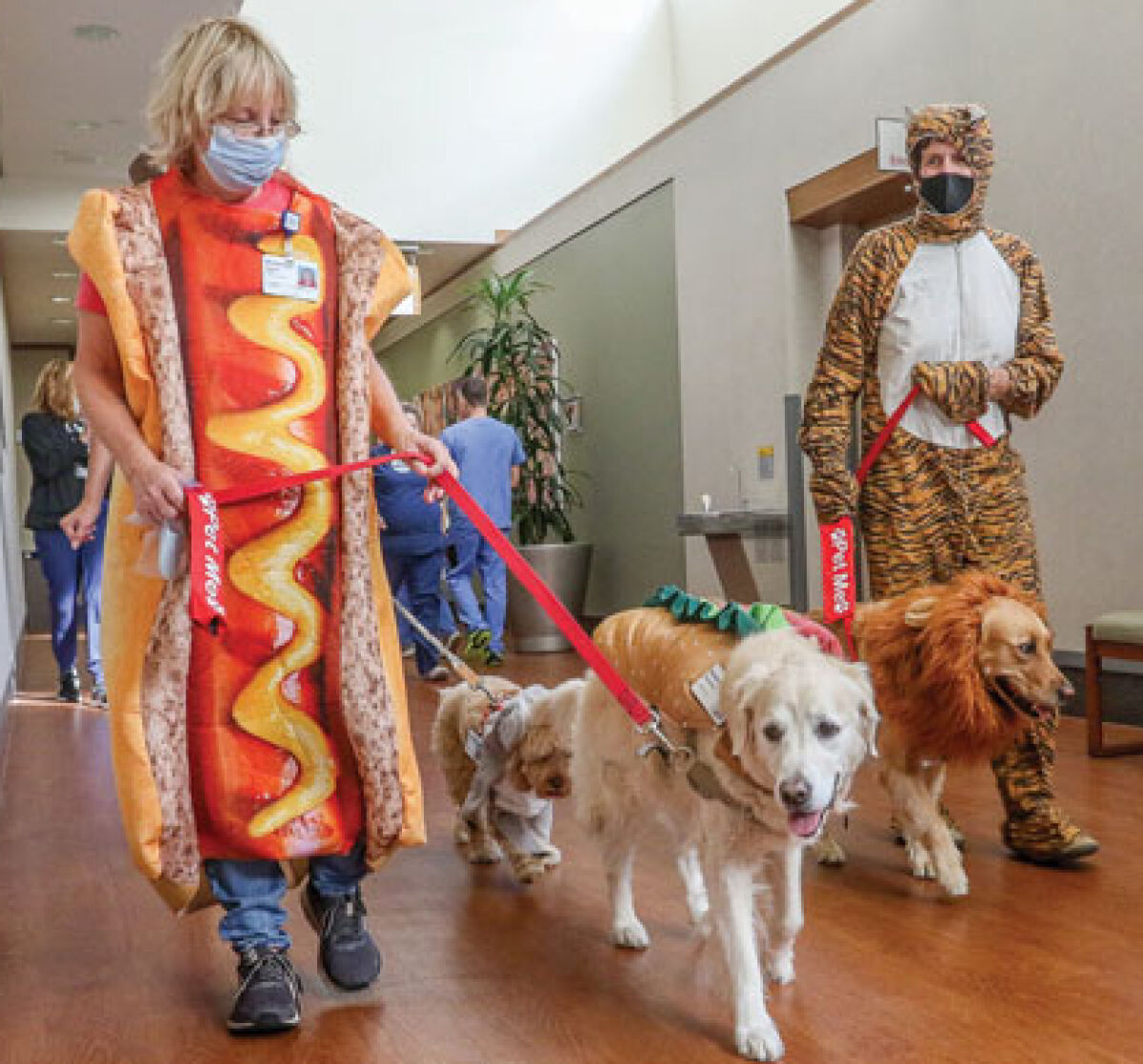 The dogs were dressed up in some colorful Halloween costumes from flowers to dinosaurs to frankfurters. They and their handlers paraded down the hospital’s main concourse before visiting several patients in their rooms.