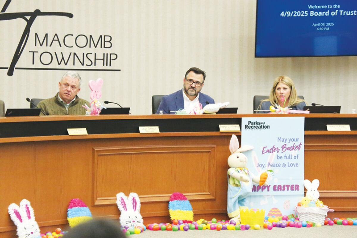 In board chambers decked in Easter decorations, members of the Macomb Township Board of Trustees listen to comments from township officials during the April 9 meeting.