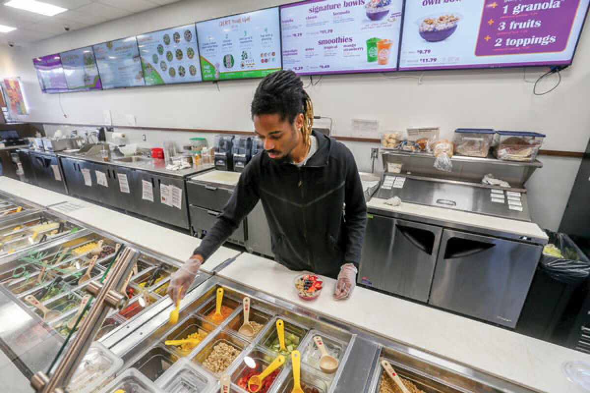 Bryan Hairston, who is an assistant manager and shift lead at Saladworks/Frutta Bowls in West Bloomfield, prepares a Frutta Bowl. Hiring employees is one of the ways businesses help support local economies.