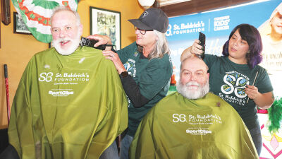 UTICA/SHELBY TOWNSHIP/ROCHESTER — Utica Mayor Gus Calandrino and Jim Gavlinski, owner of Battery Warehouse of Shelby, competed in a fundraising event for the St. Baldrick’s Foundation that had both men’s heads and beards being shaved March 29 to support childhood cancer research.